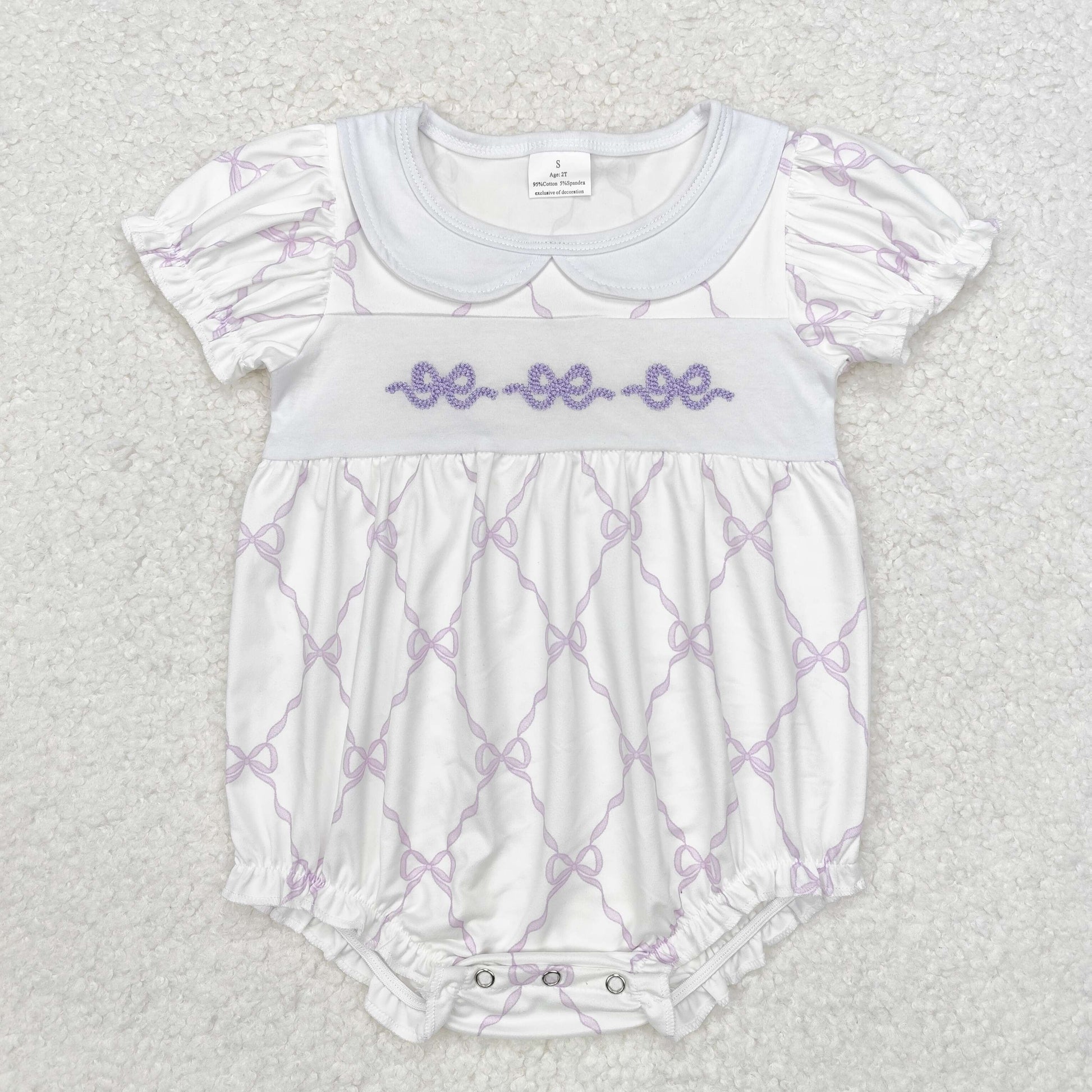 SR1968 Purple Bows Embroidery Print Baby Girls Summer Romper