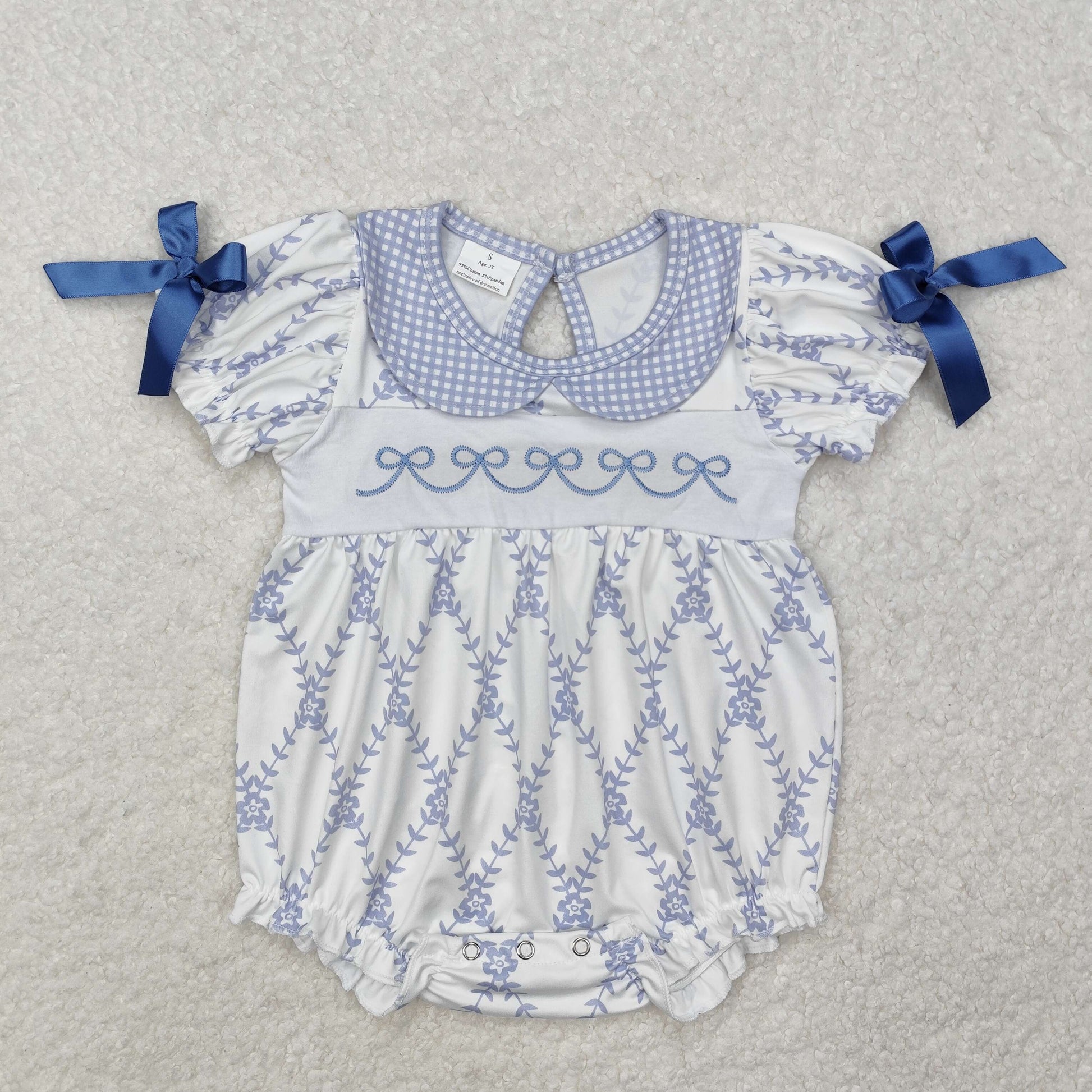 SR2146 Bows Embroidery Flowers Blue Print Baby Girls Summer Romper