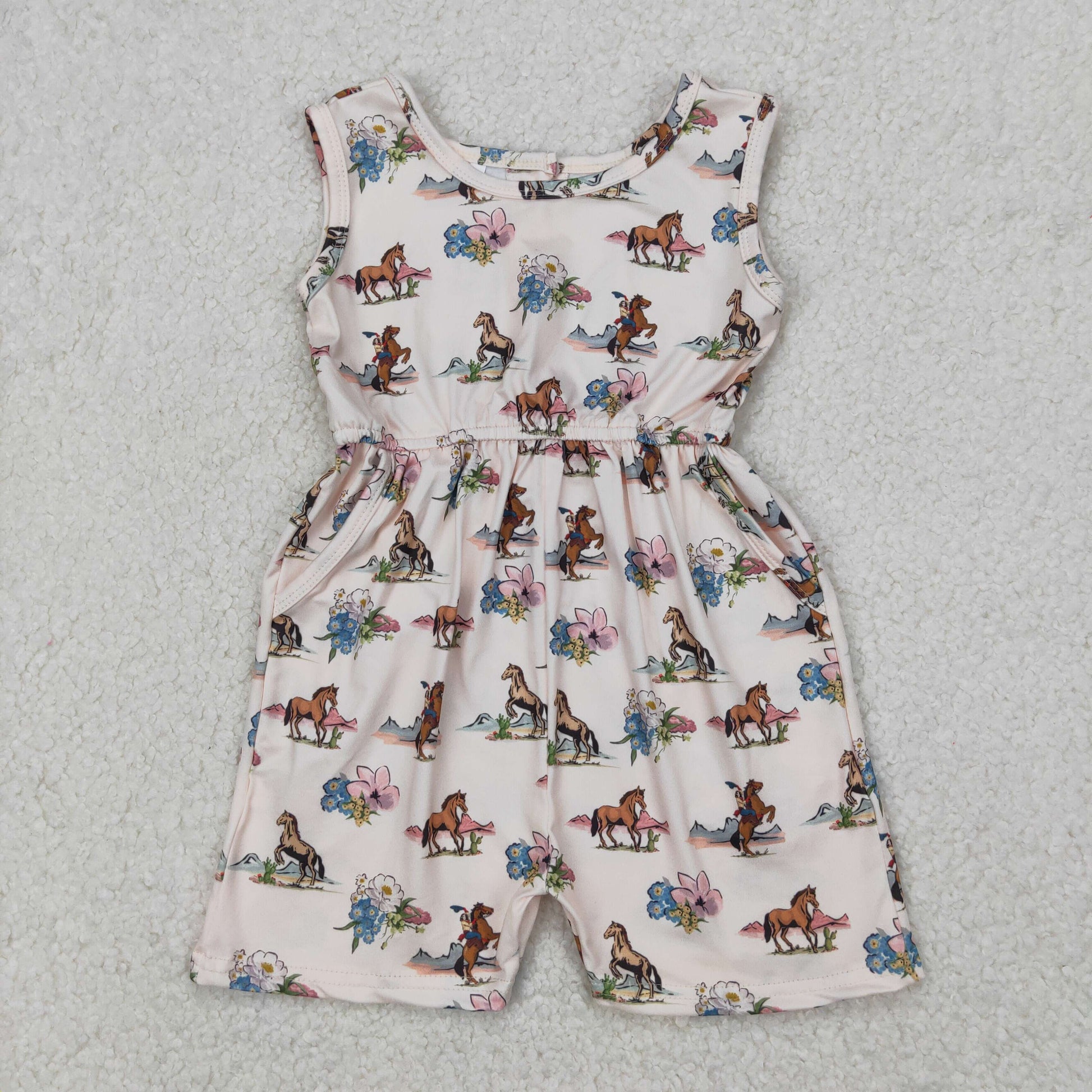 SR2695 Horse Flowers Western Print Pockets Girls Summer Jumpsuits