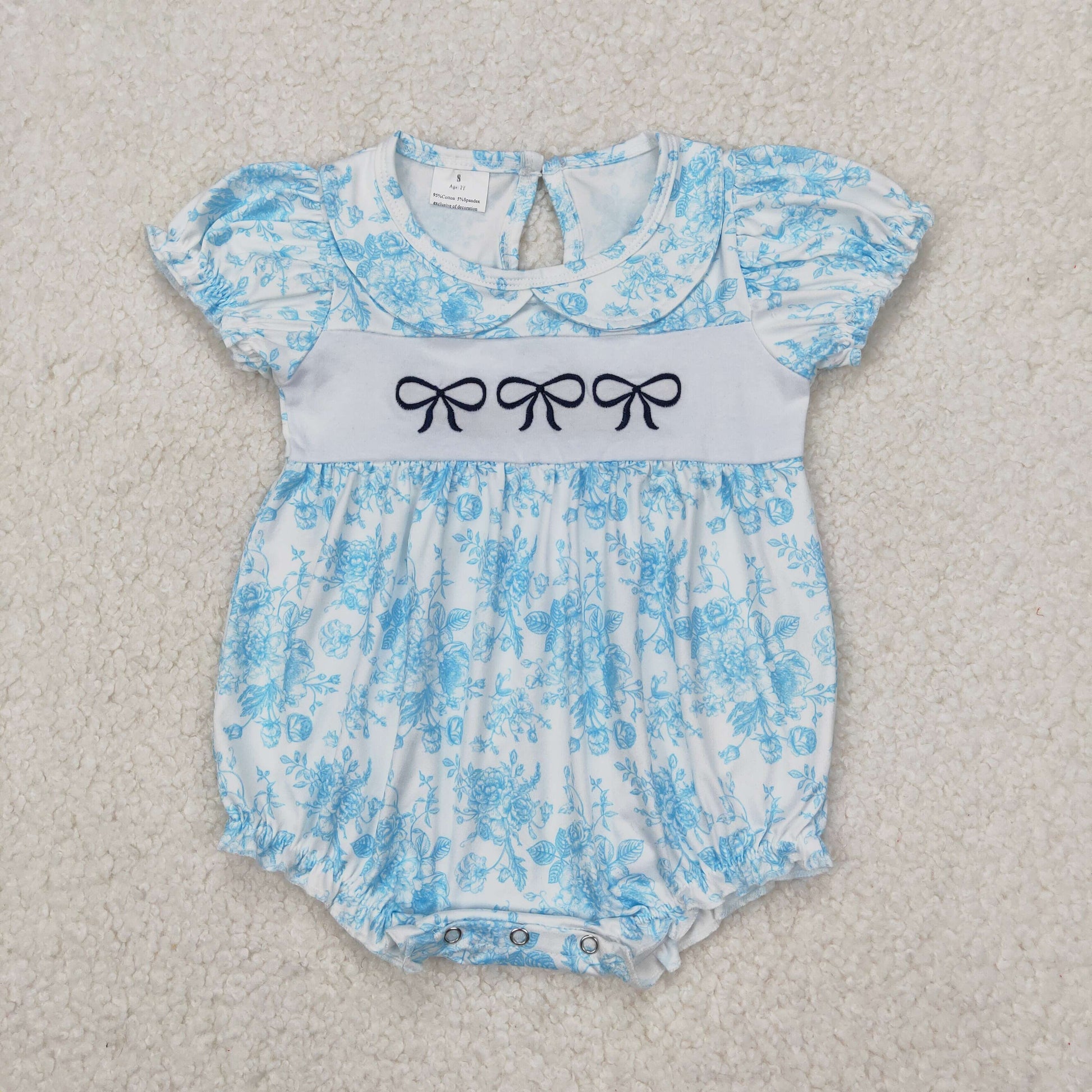 SR2784 Blue Embroidery Bows Flowers Print Baby Girls Summer Romper