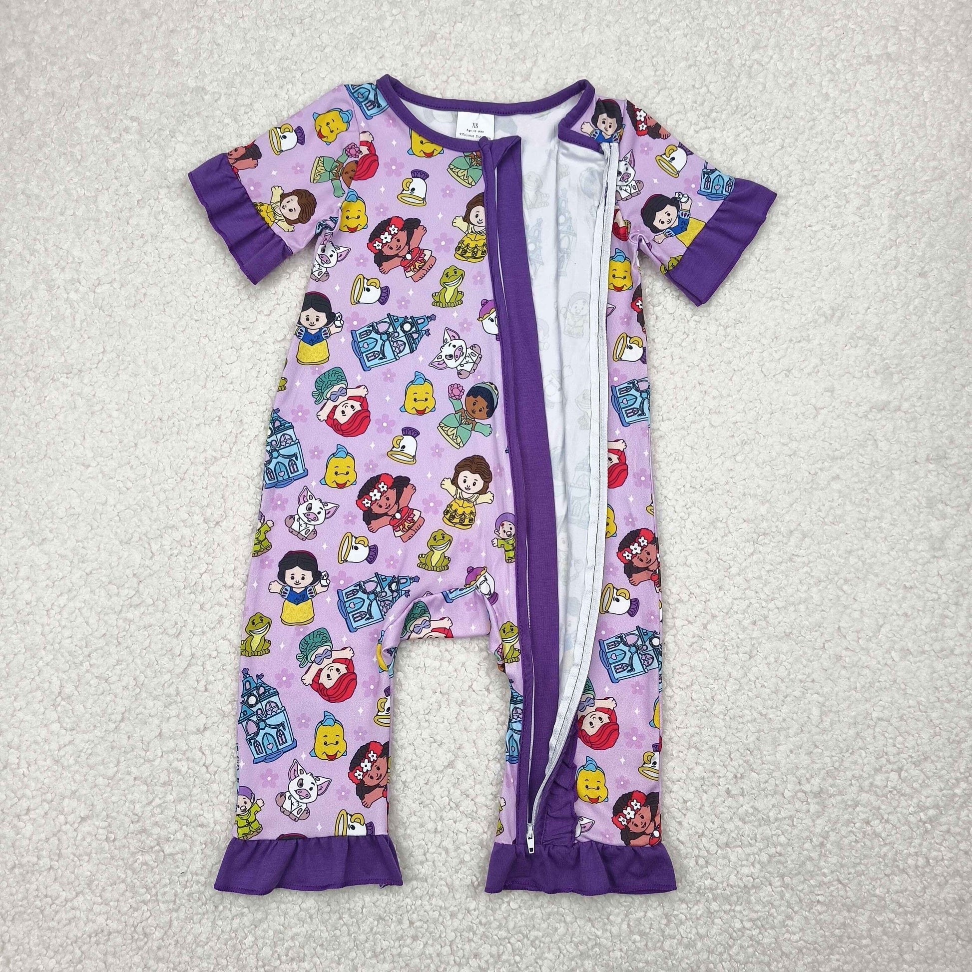 SR2870 Cartoon Princess Purple Print Baby Girls Summer Zipper Romper