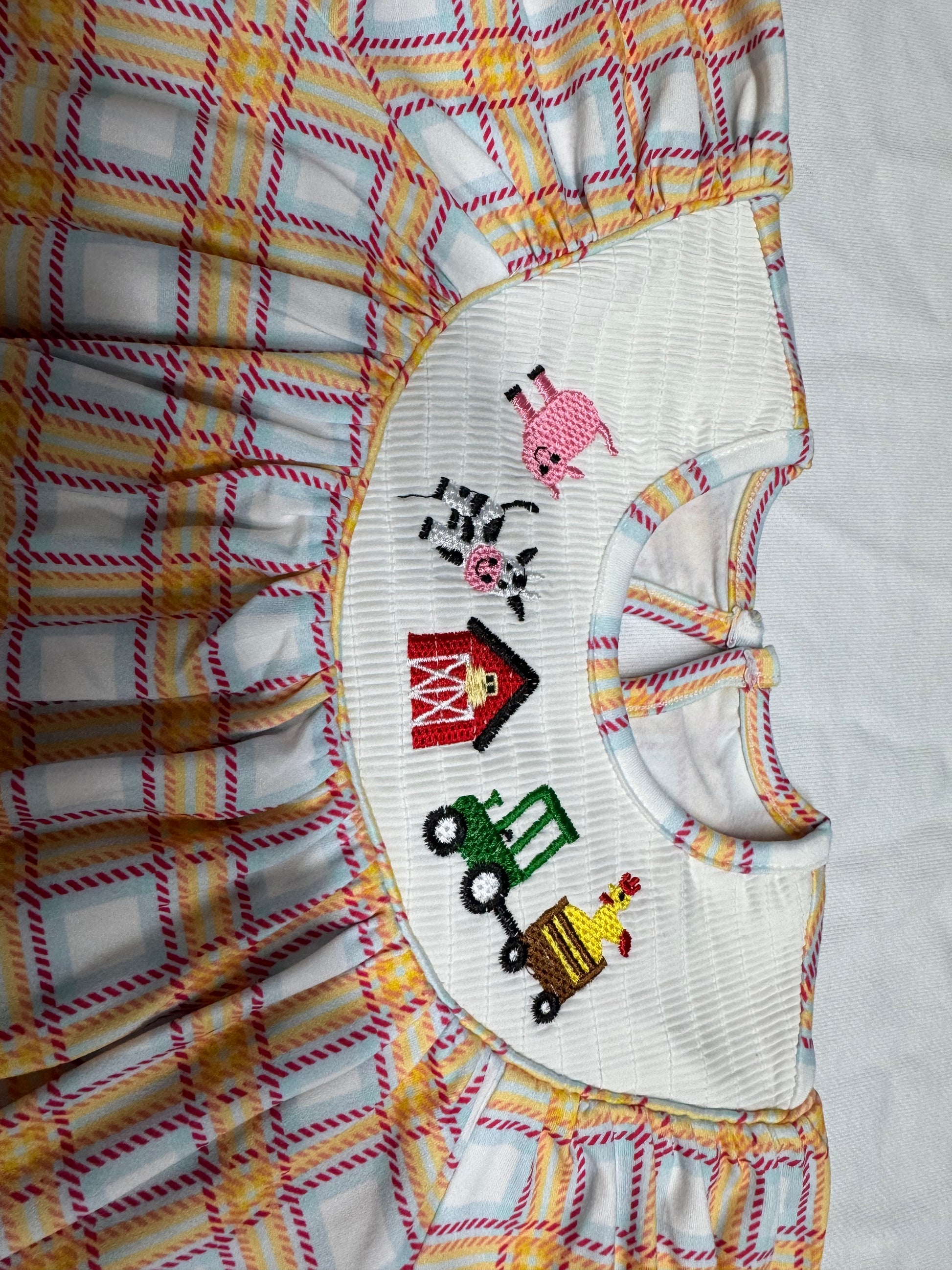 SR2982 Farm Animals Embroidery Plaid Baby Girls Smocked Bubble Romper