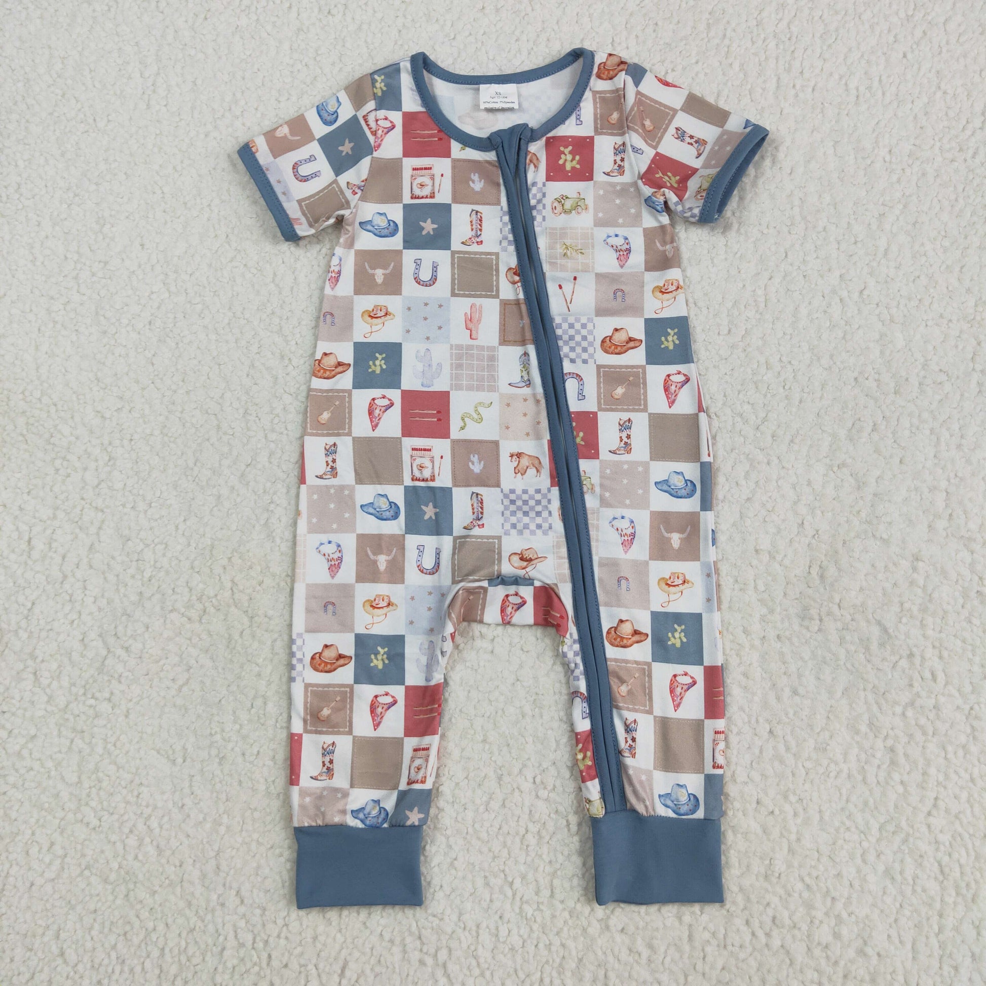 SR3098 Boots Hat Plaid Western Print Baby Boys Zipper Sleeper Romper