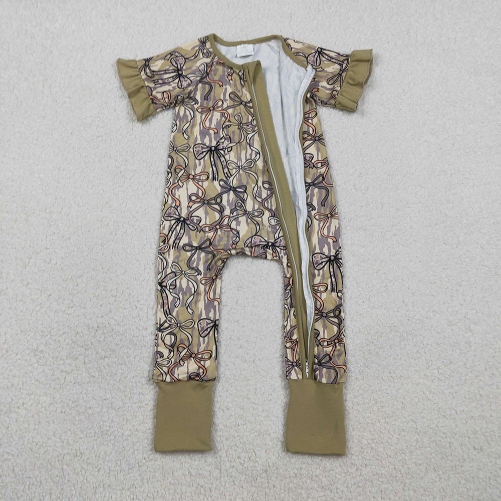 SR3931 Bows Camo Print Baby Girls Zipper Sleeper Romper