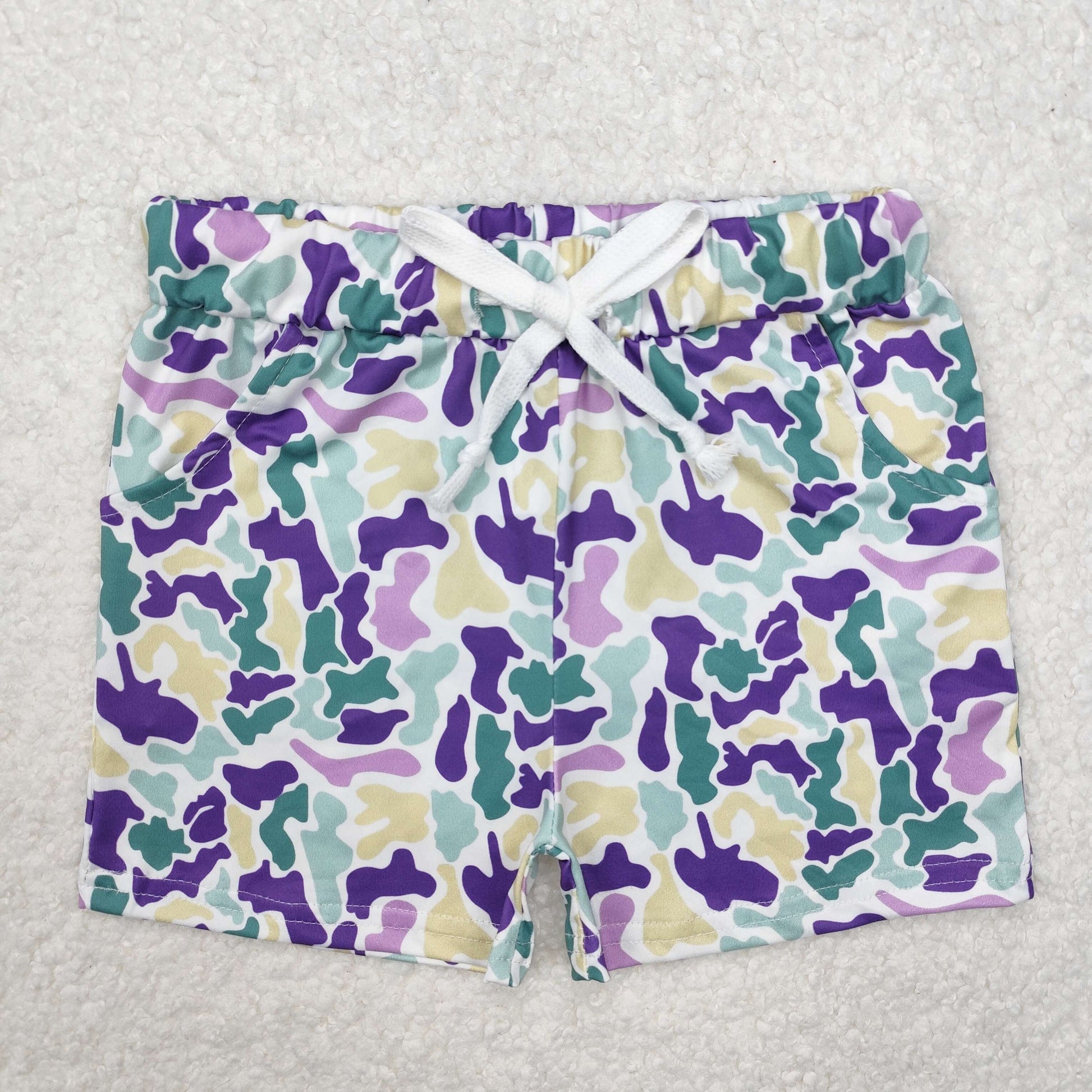 SS0433-2 Yellow Purple Green Camo Print Kids Mardi Gras Bottom Shorts