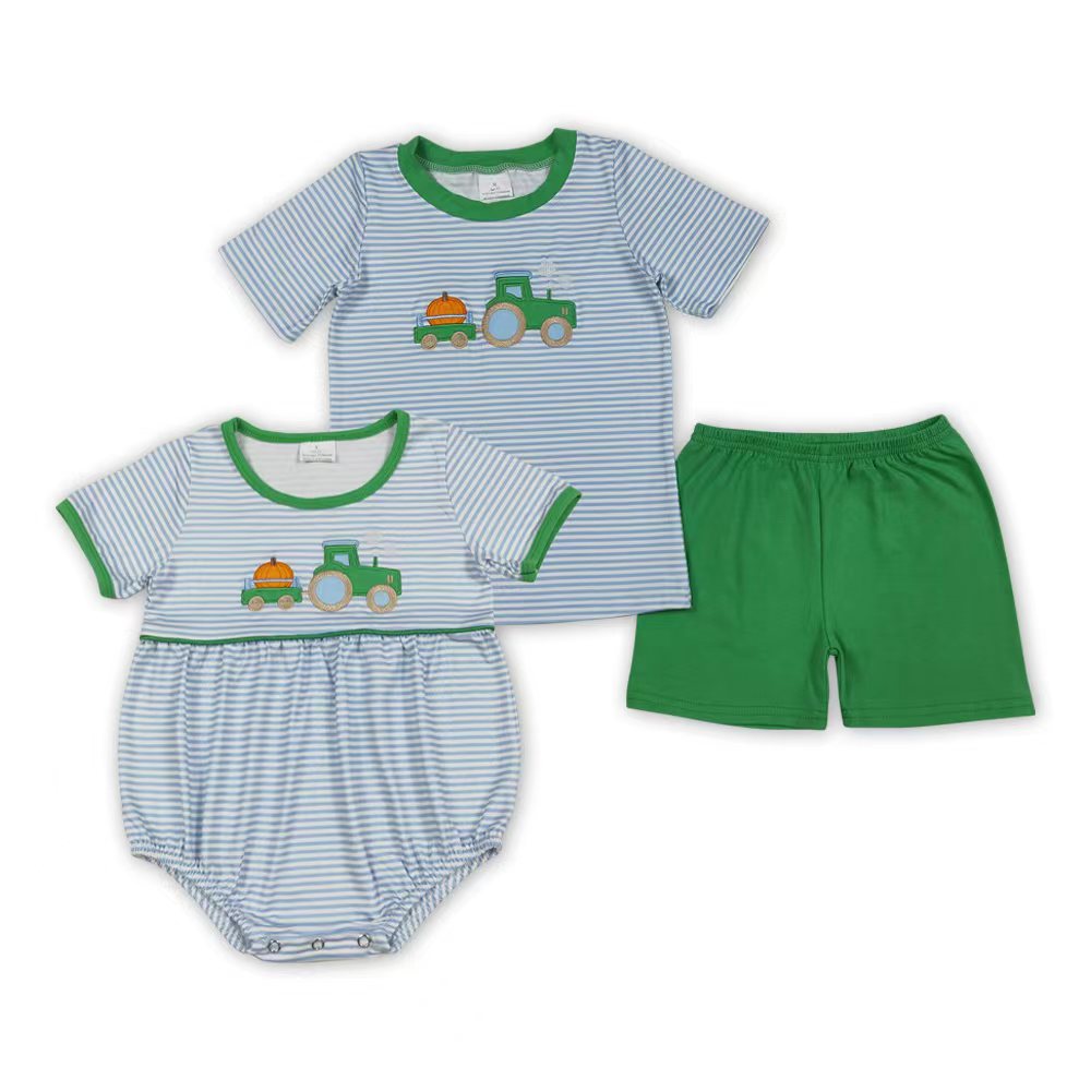 Tractors Pumpkin Embroidery Stripes Print Boys Fall Clothes Brothers Matching Wear